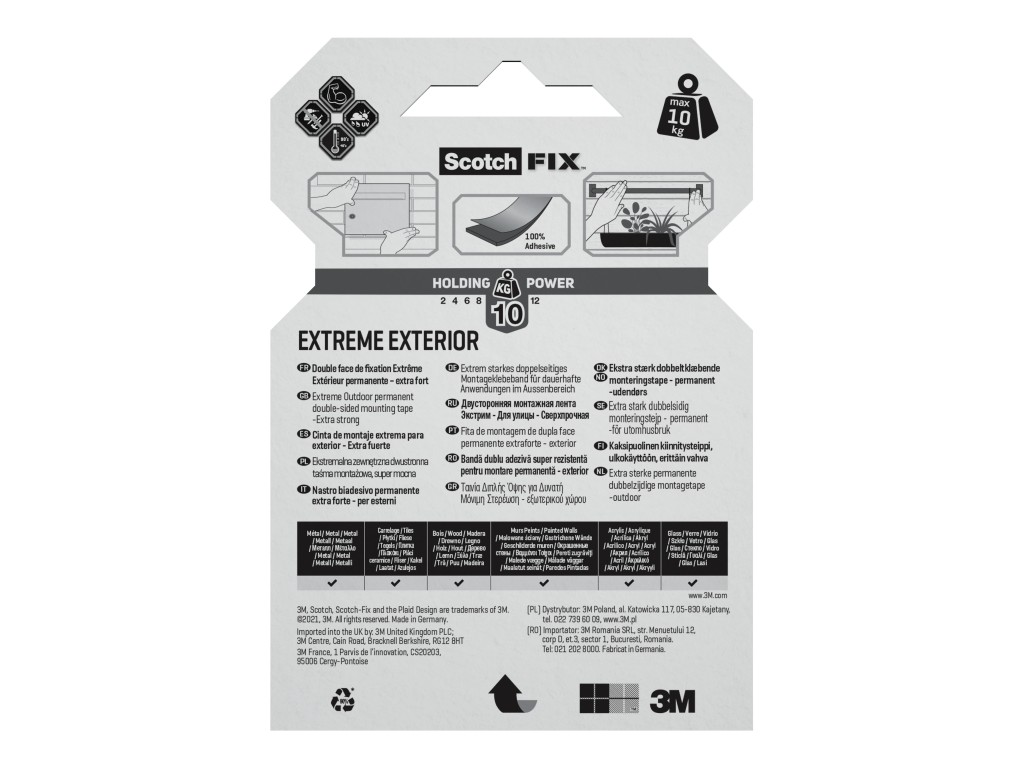 Susținând până la 10 kg, această bandă permanentă superioară, conformabilă, este destinată utilizării extreme în exterior și este ideală pe gips-carton vopsit, lemn vopsit/finisat, metal, acril, piatră netedă și beton vopsit. Rezistență sporită la factori extremi de mediu (temperaturi între -40 și +90 grade Celsius, umiditate sporită). Protecție UV.