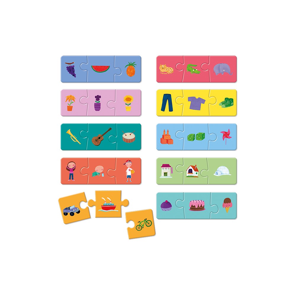 – Include 10 puzzle-uri cu ilustrații detaliate, fiecare alcătuit din 3 piese care trebuie potrivite.