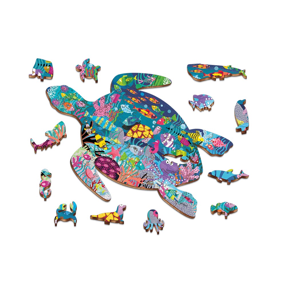 Fiecare piesă este atent ilustrată, reprezentând un peisaj marin plin de culoare și detalii fascinante. Printre piesele puzzle-ului se regăsesc 12 forme de animale, fiecare având un loc specific pe suportul de lemn. Această caracteristică unică nu doar că adaugă un plus de distracție, dar și stimulează dezvoltarea logicii și a abilităților vizual-spațiale ale copiilor.