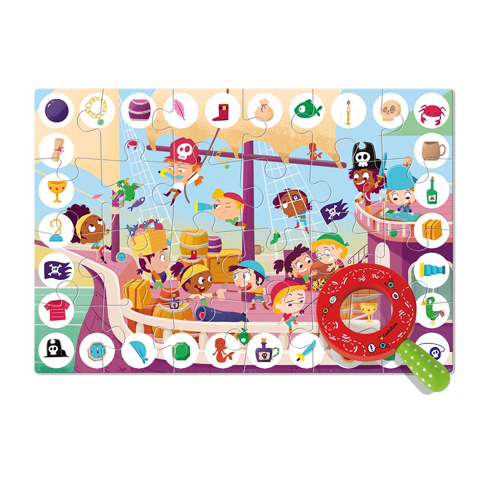 După ce puzzle-ul este complet, aventura continuă cu un joc interactiv de detectiv! Folosind lupa specială cu mâner din lemn, copiii pot căuta și găsi obiectele ascunse în imagine, stimulându-le curiozitatea și spiritul de observație.
